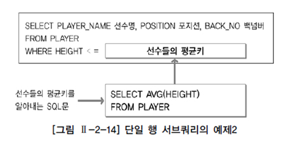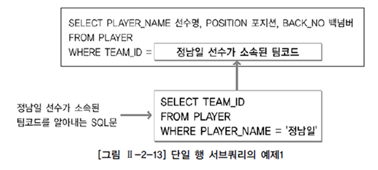 - 서브쿼리가 단일 행 비교 연산자(=, <, <=, >, >=, <>)와 함께 사용할 때는 서브쿼리의 결과 건수가 반드시 1건 이하이어야 한다.