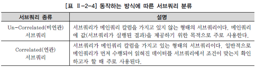 - 서브쿼리 내에 메인쿼리 칼럼이 사용된 서브쿼리이다.