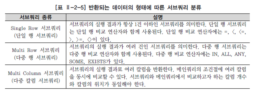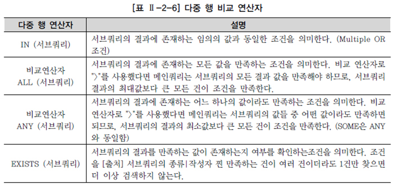 - 단일 행 비교 연산자는 서브쿼리의 결과가 반드시 1건 이하이어야 하고, 복수 행 비교 연산자는 서브쿼리의 결과 건수와 상관 없다.