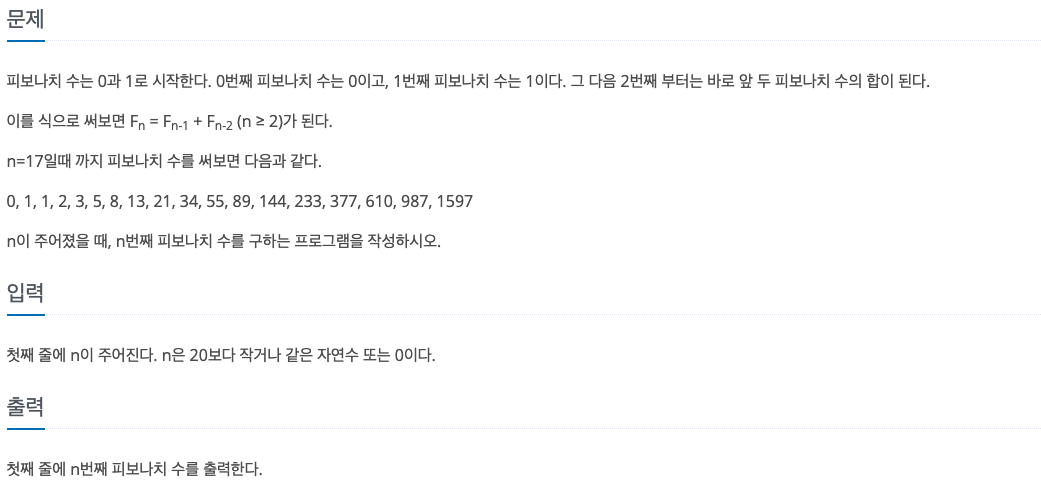 피보나치 수는 0과 1로 시작한다. 0번째 피보나치 수는 0이고, 1번째 피보나치 수는 1이다. 그 다음 2번째 부터는 바로 앞 두 피보나치 수의 합이 된다. 이를 식으로 써보면 Fn = Fn-1 + Fn-2 (n ≥ 2)가