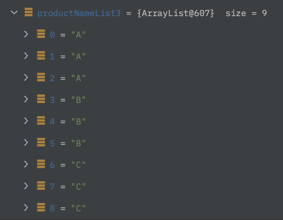 .distinct()가 추가되어 중복이 제거된 "A", "B", "C"를 가진 String 타입의 List 결과를 리턴받을 수 있다.