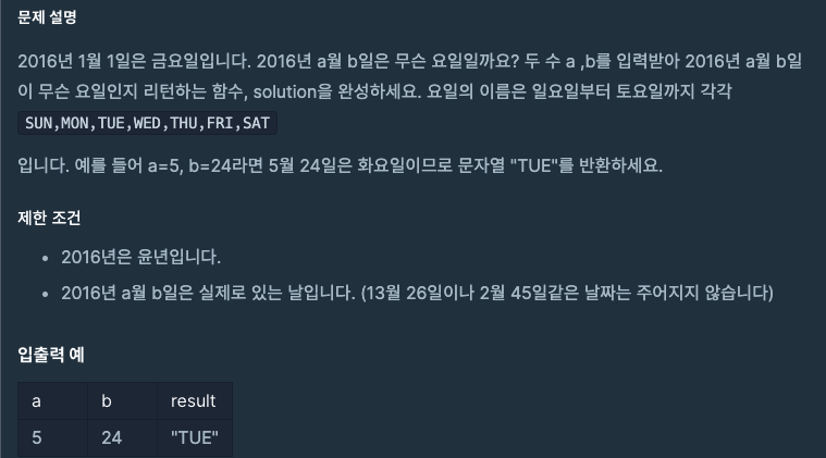 2016년 1월 1일은 금요일입니다. 2016년 a월 b일은 무슨 요일일까요? 두 수 a ,b를 입력받아 2016년 a월 b일이 무슨 요일인지 리턴하는 함수, solution을 완성하세요. 요일의 이름은 일요일부터 토요일까