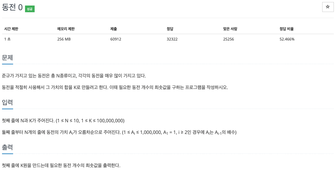 첫째 줄에 N과 K가 주어진다. (1 ≤ N ≤ 10, 1 ≤ K ≤ 100,000,000) 둘째 줄부터 N개의 줄에 동전의 가치 Ai가 오름차순으로 주어진다. (1 ≤ Ai ≤ 1,000,000, A1 = 1, i ≥ 2인 경우에 Ai는 Ai-1의 배수)