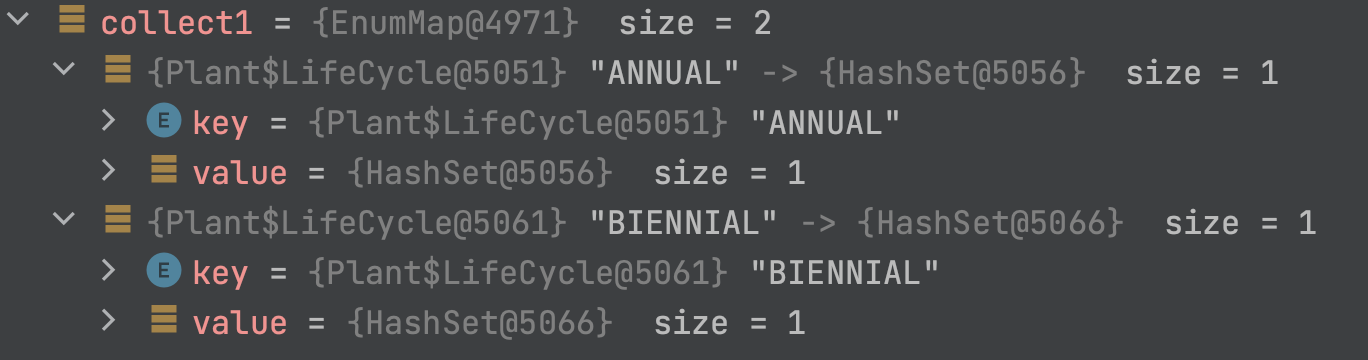 매개변수 3개의 Collectors.groupintBy 메서드는 mapFactory 매개변수에 원하는 맵 구현체를 명시하여 호출할 수 있다. 스트림을 사용할 경우 EnumMap만 사용했을 경우와 조금 다르게 동작한다. 만약 생애주기에 한해살이, 여러해살이 식물만 있고 두해살이는 없다면 EnumMap 버전에서는 맵을 3개 만드는 반면, 스트림은 2개만 만든다. 스트림은 해당 생애주기에 속하는 식물이 있을 때만 만든다.