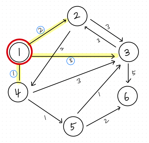 1) 여기서, [3] 노드에 주목하자. [1] 노드 -> [3] 노드 보다, [1] -> [4] -> [3] 노드로 가는 것이 거리가 더 짧다. 그러므로 갱신된다.