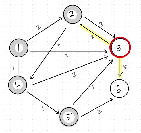 * 꺼낸 원소 : (거리 : 5, 노드 : 3) : 노드 3번은 이미 처리되었으므로 무시된다.