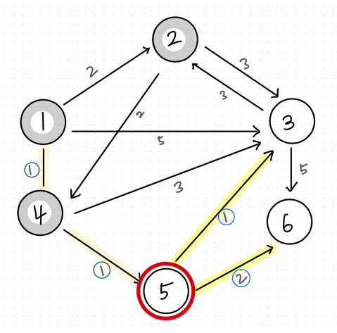 2) [5] 노드도 [1] -> [4] -> [5] 가 2이므로 2로 갱신된다.