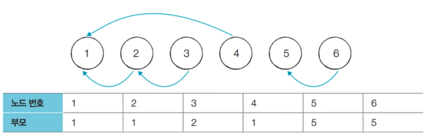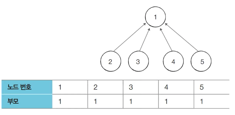 만약 입력이 아래와 같을 경우, 노드번호와 부모 테이블의 모습은 이미지와 같다.