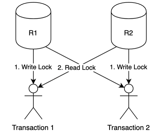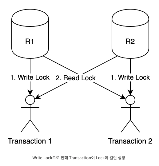 두 트랜잭션이 각각 Lock을 설정하고, 서로의 Lock에 접근하여 값을 얻어오려고 할때 서로의 Lock으로 인해 양쪽 트랜잭션이 영원히 처리되지 않는 상태이다. 상대방 Lock이 끝나야 원하는 데이터를 가져오는데 바라보고 있는 서로의 Lock이 같은 상태가 되다보니 영원히 끝나지 않은 상황이 발생하게된다.