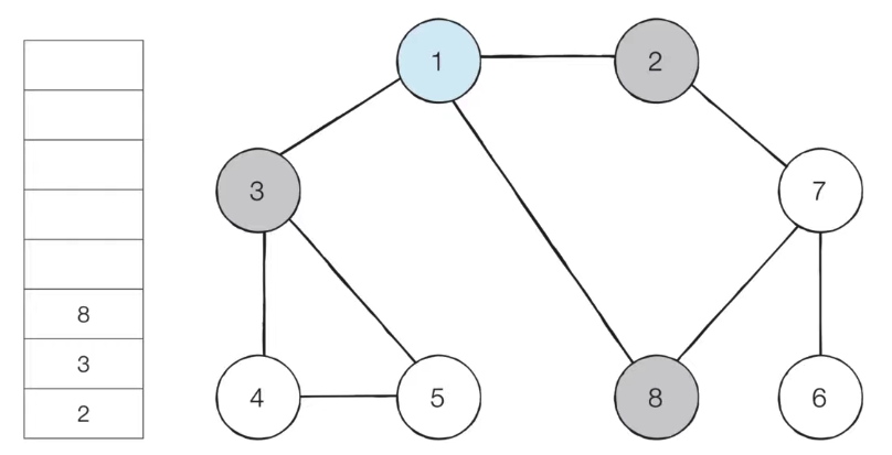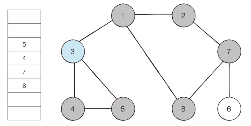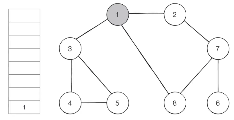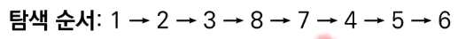 5) 큐에서 노드 '8'을 꺼내고, 방문하지 않은 인접 노드가 없으므로 무시한다.