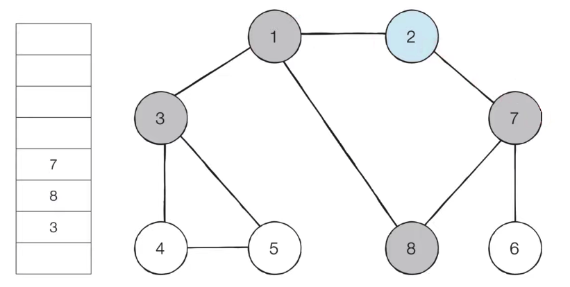 3) 큐에서 노드 '2'를 꺼낸다. 그리고, 노드 '2'에 인접한 노드 '7'을 큐에 삽입하고 방문 처리한다.