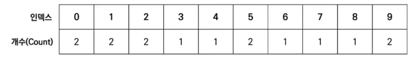 1) 원소를 모두 순회하여, List 객체의 인덱스에 해당 숫자가 나오면 +1을 해준다.