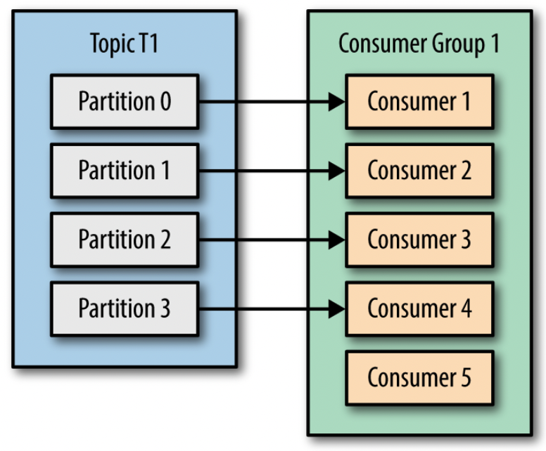 - 컨슈머 5개로 이루어진 컨슈머 그룹이 4개의 파티션에 할당되어 1개의 컨슈머가 유휴 상태