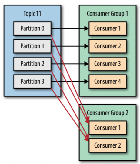 컨슈머 그룹으로 묶인 컨슈머들은 토픽의 1개 이상 파티션들에 할당되어 데이터를 가져갈 수 있다.