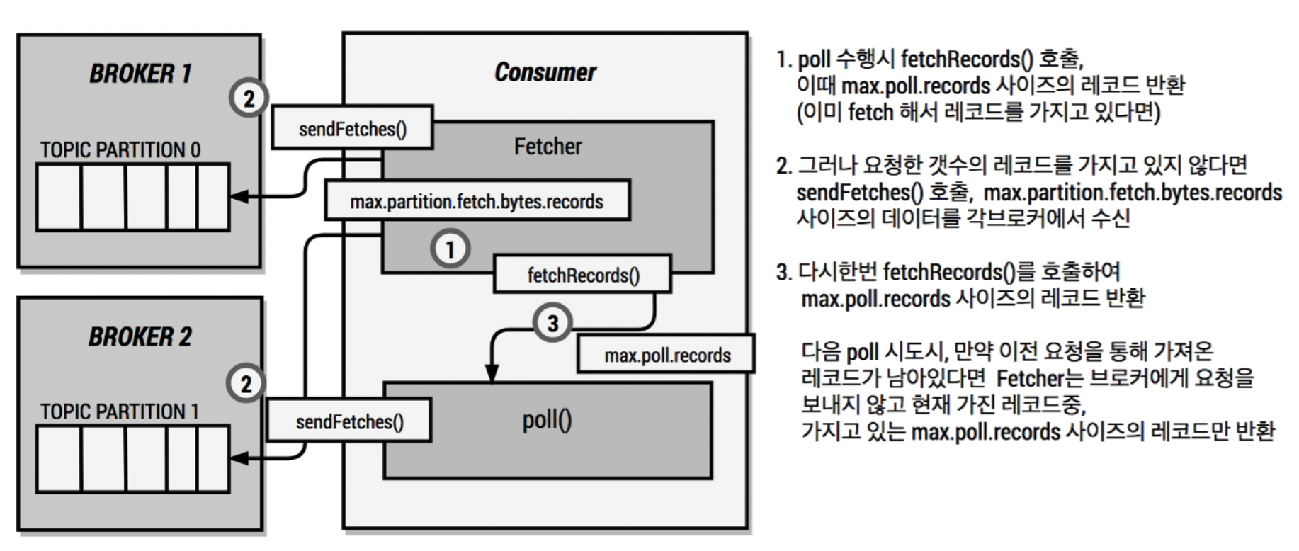 컨슈머는 poll 메서드를 통해 레코드를 반환하지만, poll() 메서드를 호출하는 시점에 클러스터에서 데이터를 가져오는 것은 아니다. 컨슈머 애플리케이션을 실행하게되면 내부에서 Fetcher 인스턴스가 생성되어 poll() 메서드를 호출하기 전에 미리 레코드들을 내부 큐로 가지고온다.