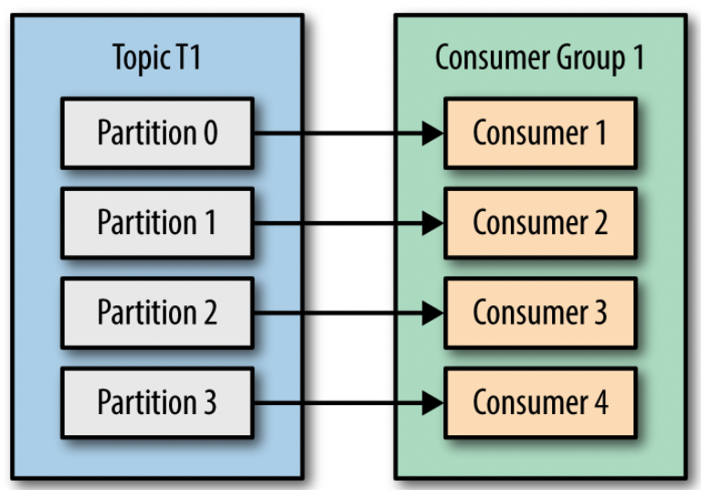 - 컨슈머 4개로 이루어진 컨슈머 그룹이 4개의 파티션에 할당