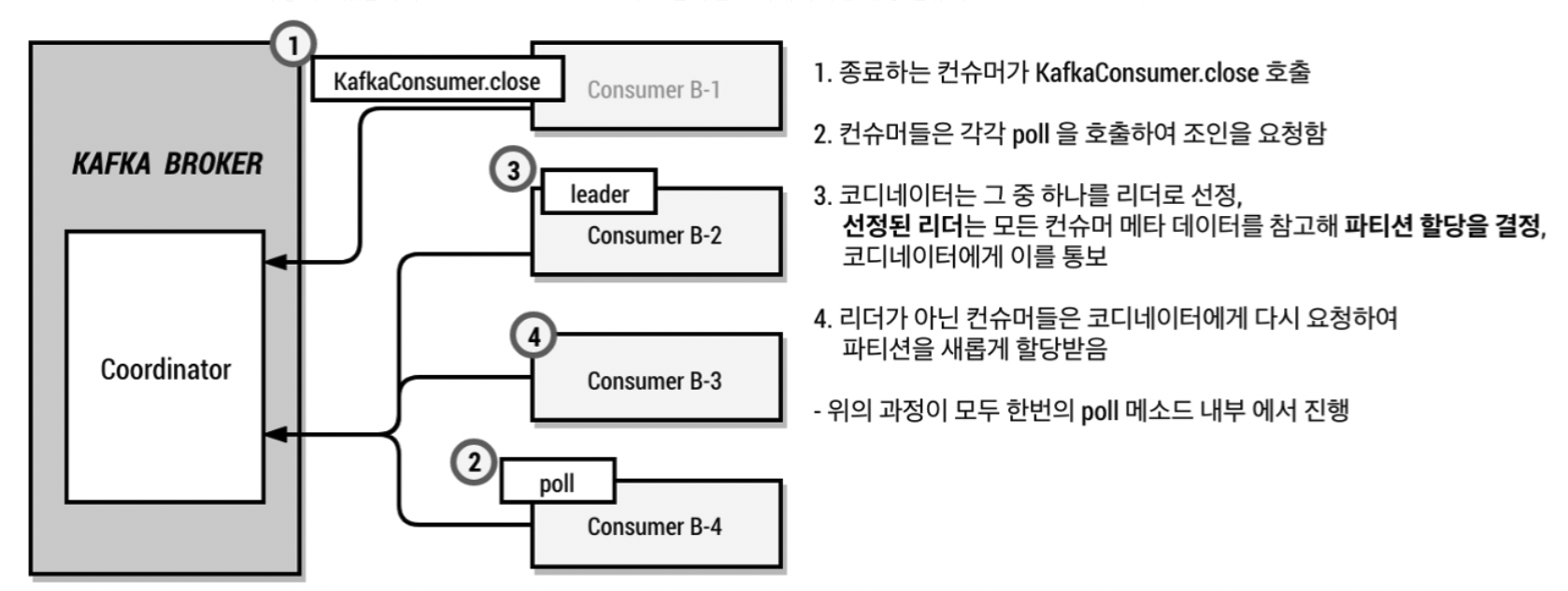 이를 해소하기 위해 이슈가 발생한 컨슈머를 컨슈머 그룹에서 제외하여 모든 파티션이 지속적으로 데이터를 처리할 수 있도록 가용성을 높여준다. 리밸런싱은 컨슈머가 데이터를 처리하는 도중에 언제든지 발생할 수 있으므로 데이터 처리 중 발생한 리밸런싱에 대응하는 코드를 작성해야한다.