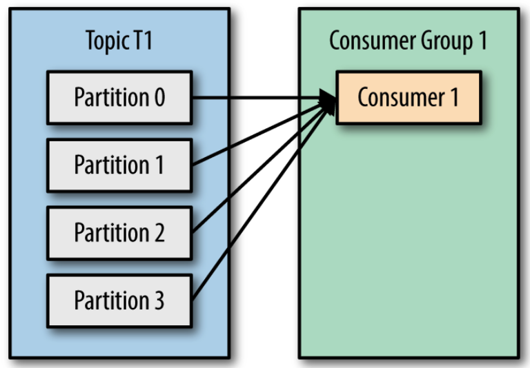 - 컨슈머 1개로 이루어진 컨슈머 그룹이 4개의 파티션에 할당
