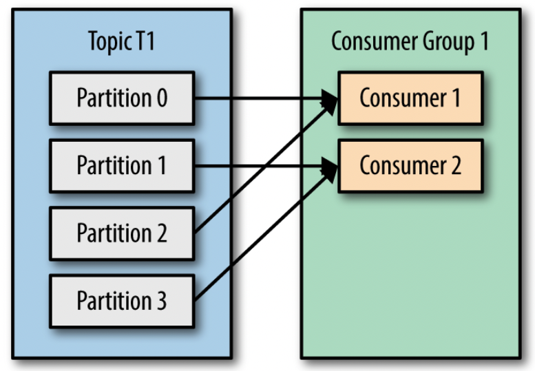 - 컨슈머 2개로 이루어진 컨슈머 그룹이 4개의 파티션에 할당