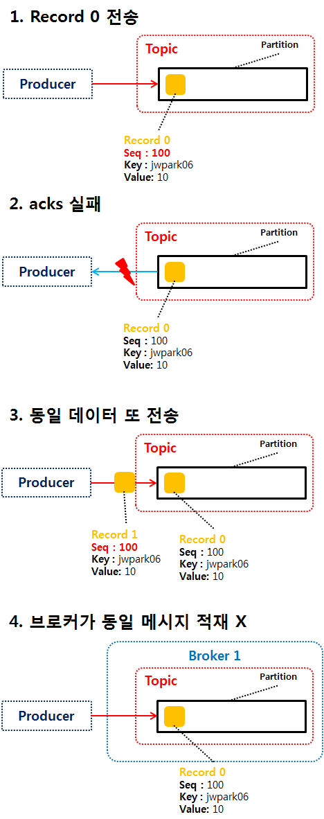 정확히 말하자면, 멱등성 프로듀서가 정확히 한번 브로커에 데이터를 적재하기 위해 정말로 한번 전송하는 것이 아닌, 상황에 따라 프로듀서가 여러번 전송하되 브로커가 여러번 전송된 데이터를 확인하고 중복된 데이터는 적재하지 않는 것이다.