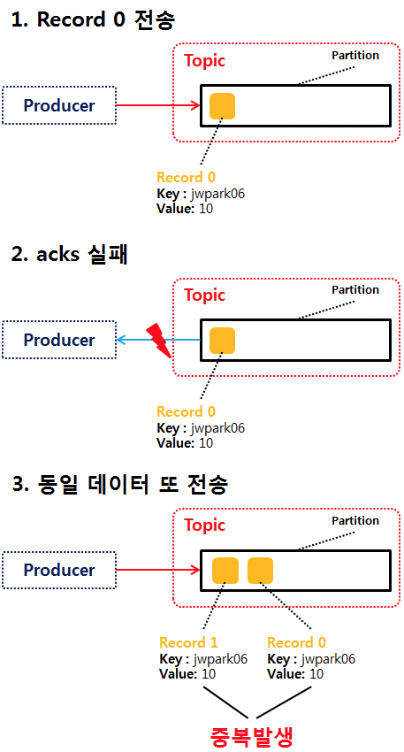 기본 프로듀서의 동작 방식은 적어도 한번 전달(at least once delivery)을 지원한다.