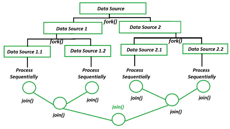 하나의 큰 작업이 생성되면 해당 작업을 분할할 수 있는지 판단하고, 분할할 수 있다면 하위 작업으로 분할한다. 그리고 분할할 수 있을 때까지 계속 하위 작업으로 분할한다. 이후 분할된 모든 하위 작업이 완료될 때까지 대기한 후에 그 결과를 취합해서 최종 결과물로 만든다.