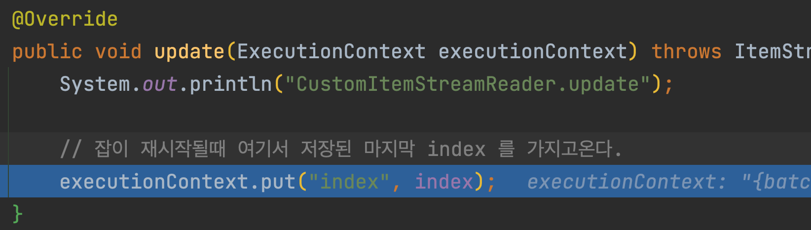 if (executionContext.containsKey("index")) { // index 키 데이터가 DB에 저장되어있다는 얘기