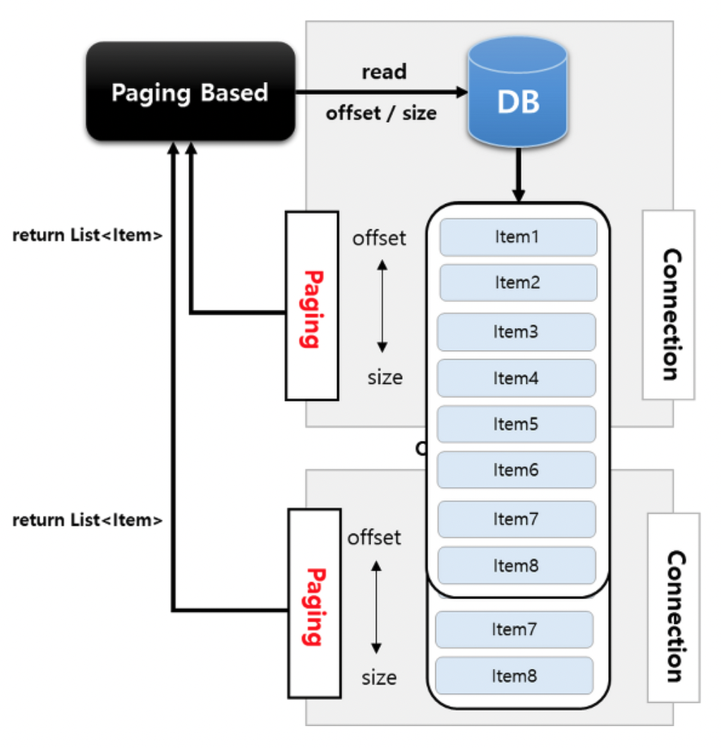 - 한 페이지를 읽을때마다 Connection을 맺고 끊기 때문에 대량의 데이터를 처리하더라도 SocketTimeout 예외가 거의 발생하지 않는다.