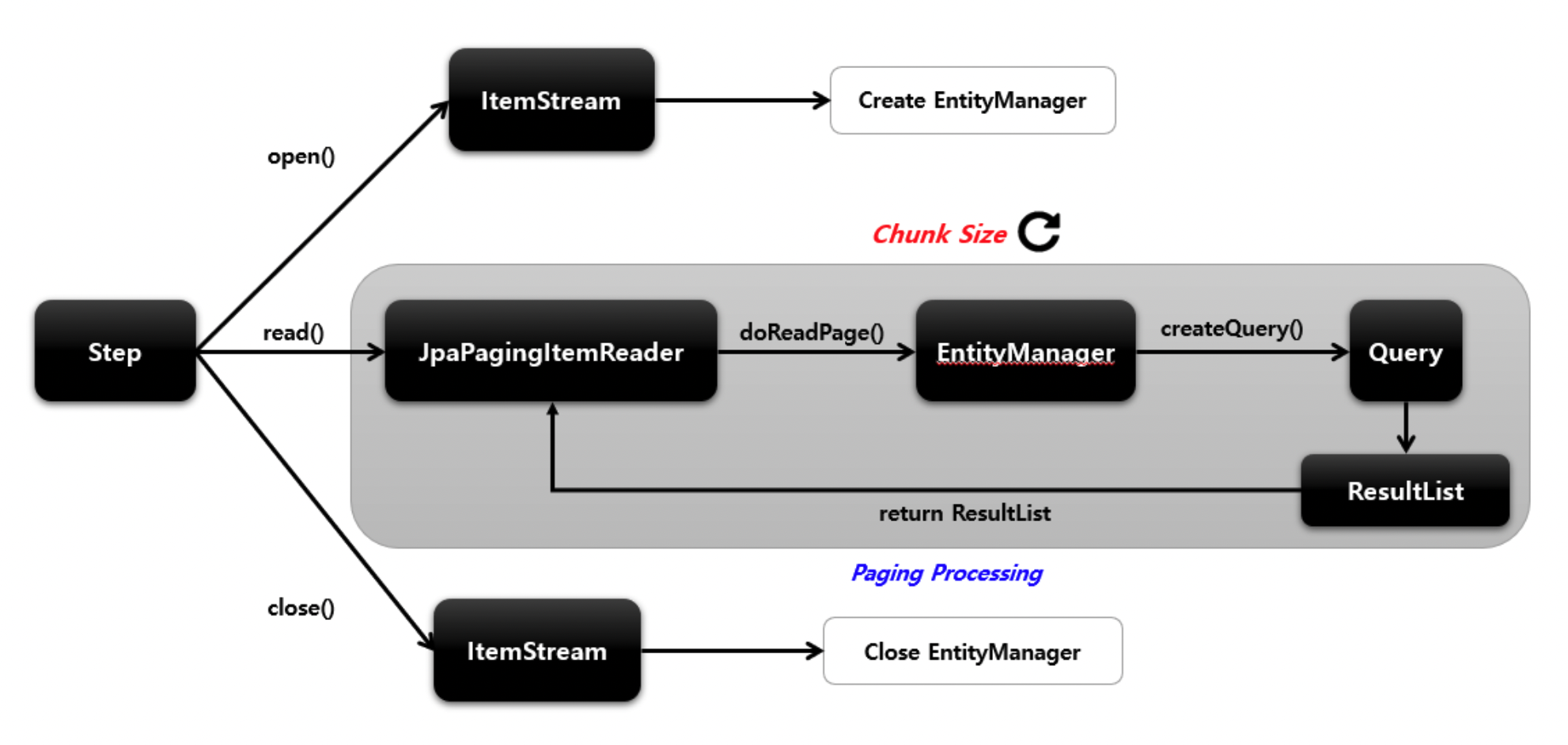 | JpaPagingItemReader 생성 | JpaPagingItemReader - doOpen() 호출 -> entityManager 생성 |