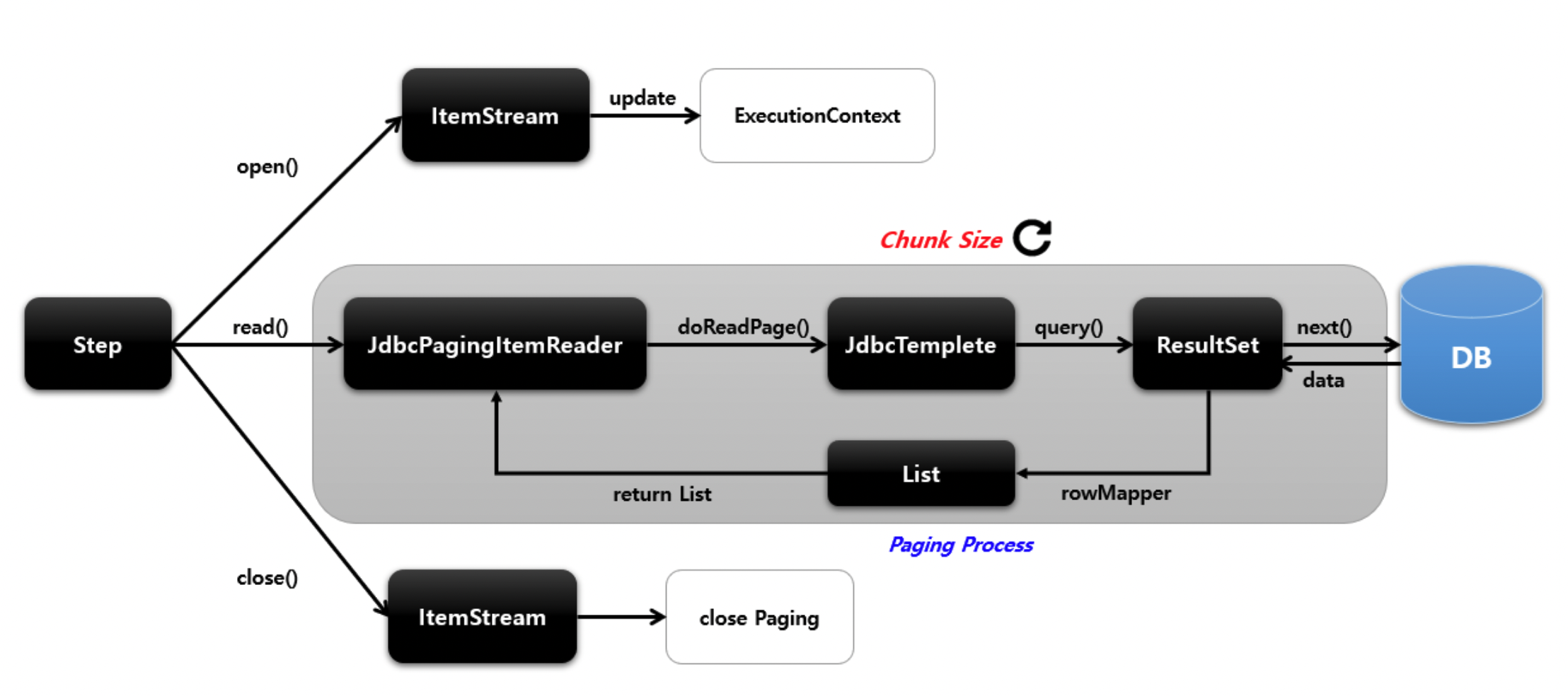 | doReadPage() | JpaPagingItemReader - doReadPage() - 쿼리 수행 (pageSize 만큼 데이터를 가져온다.) |