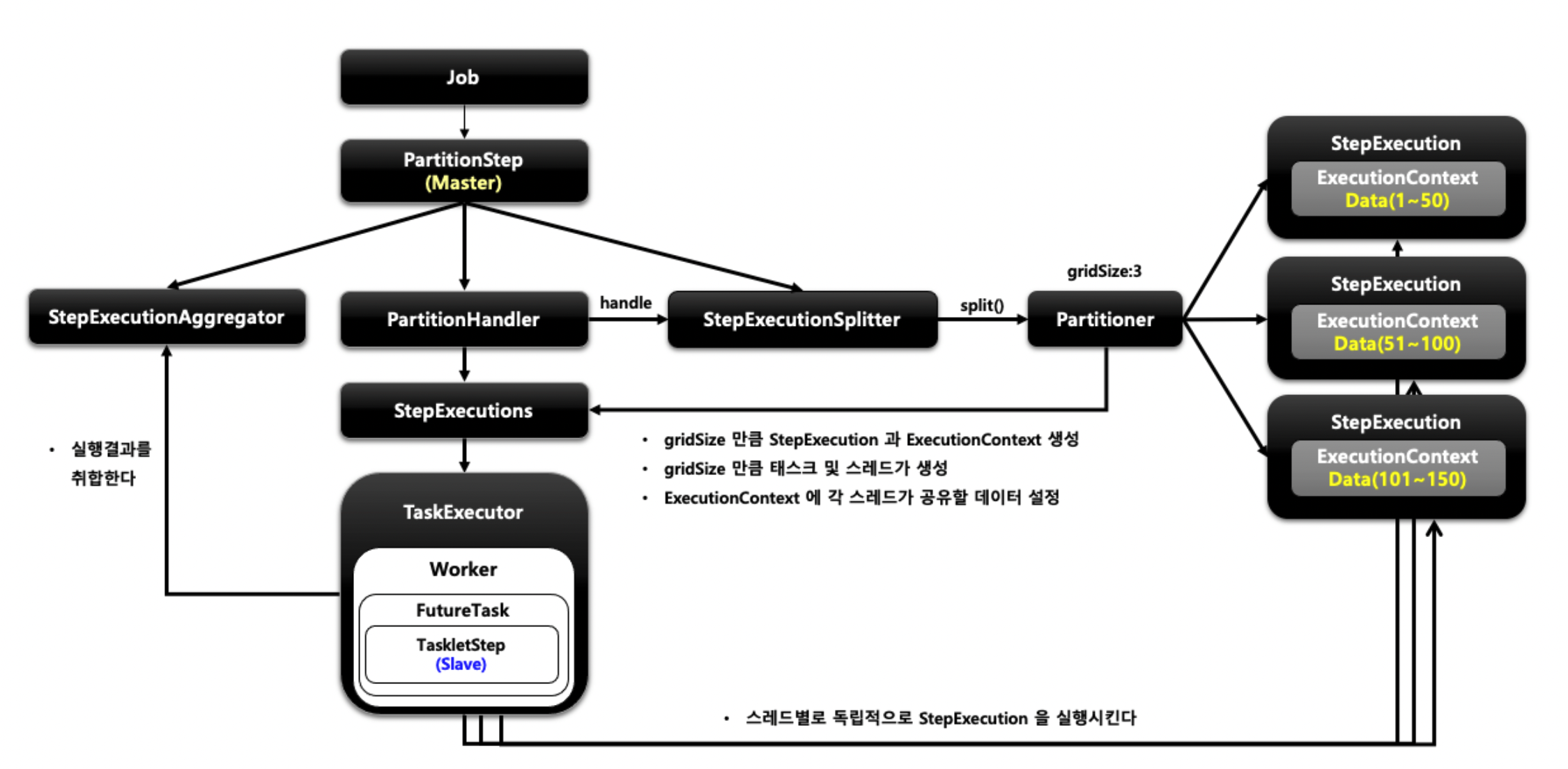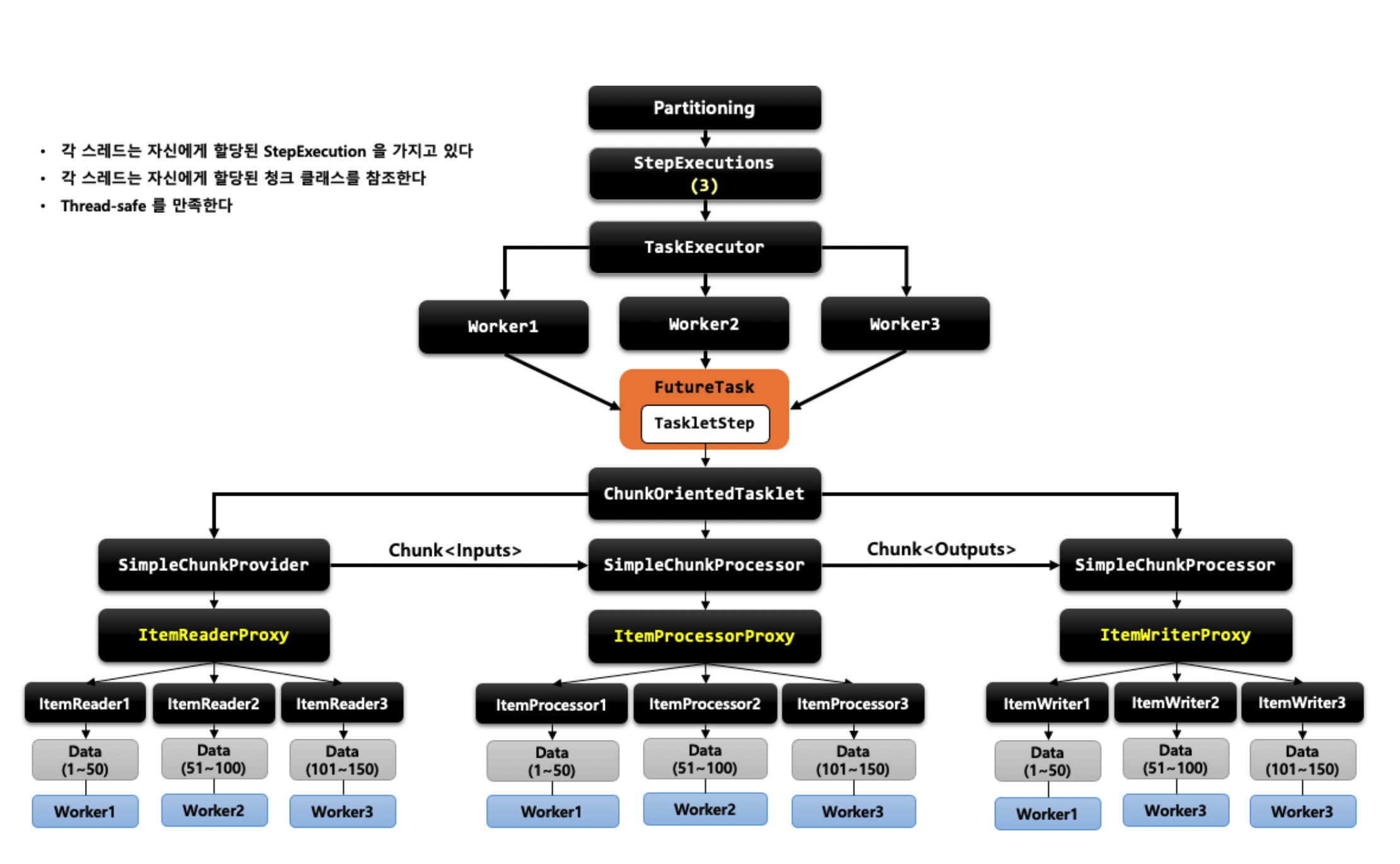 - SlaveStep은 ItemReader / ItemProcessor / ItemWriter 등을 가지고 동작하며 작업을 독립적으로 병렬 처리한다.