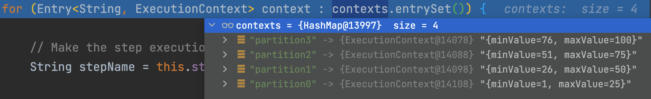 4개의 SlaveStep이 25개씩 데이터를 수행하게 된다. 여기서 각각이 독립적으로 ExecutionContext를 가지고있음을 확인할 수 있다.