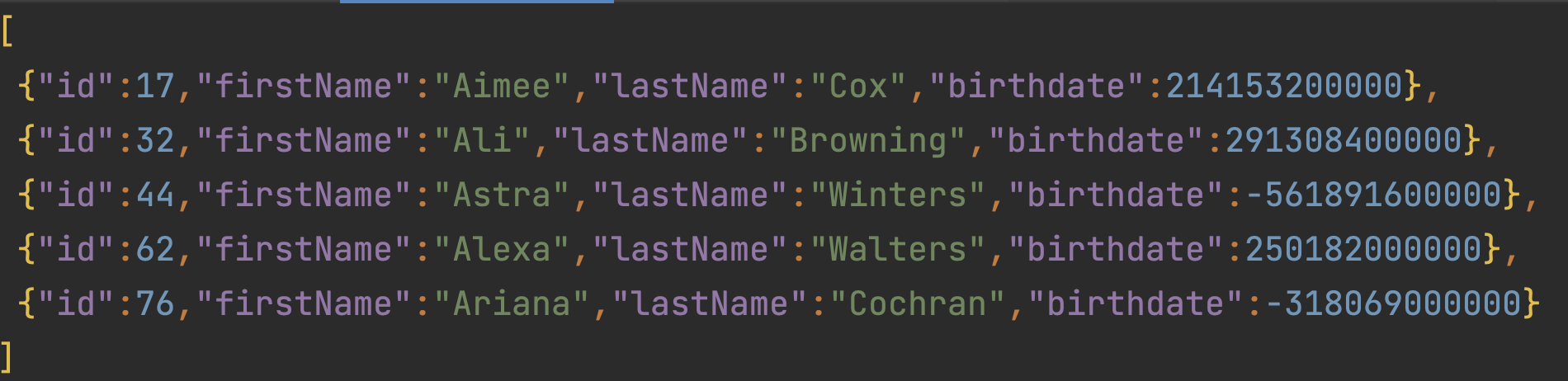 INSERT INTO customer (id,firstname,lastname,birthdate) VALUES (61,'Norman','Tanner','1959-07-29 15:41:45'),(62,'Alexa','Walters','1977-12-06 16:41:17'),(63,'Dara','Hyde','1989-08-04 14:06:43'),(64,'Hu','Sampson','1978-11-01 17:10:23'),(65,'Jasmine','Cardenas','1969-02-15 20:08:06'),(66,'Julian','Bentley','1954-07-11 03:27:51'),(67,'Samson','Brown','1967-10-15 07:03:59'),(68,'Gisela','Hogan','1985-01-19 03:16:20'),(69,'Jeanette','Cummings','1986-09-07 18:25:52'),(70,'Galena','Perkins','1984-01-13 02:15:31');