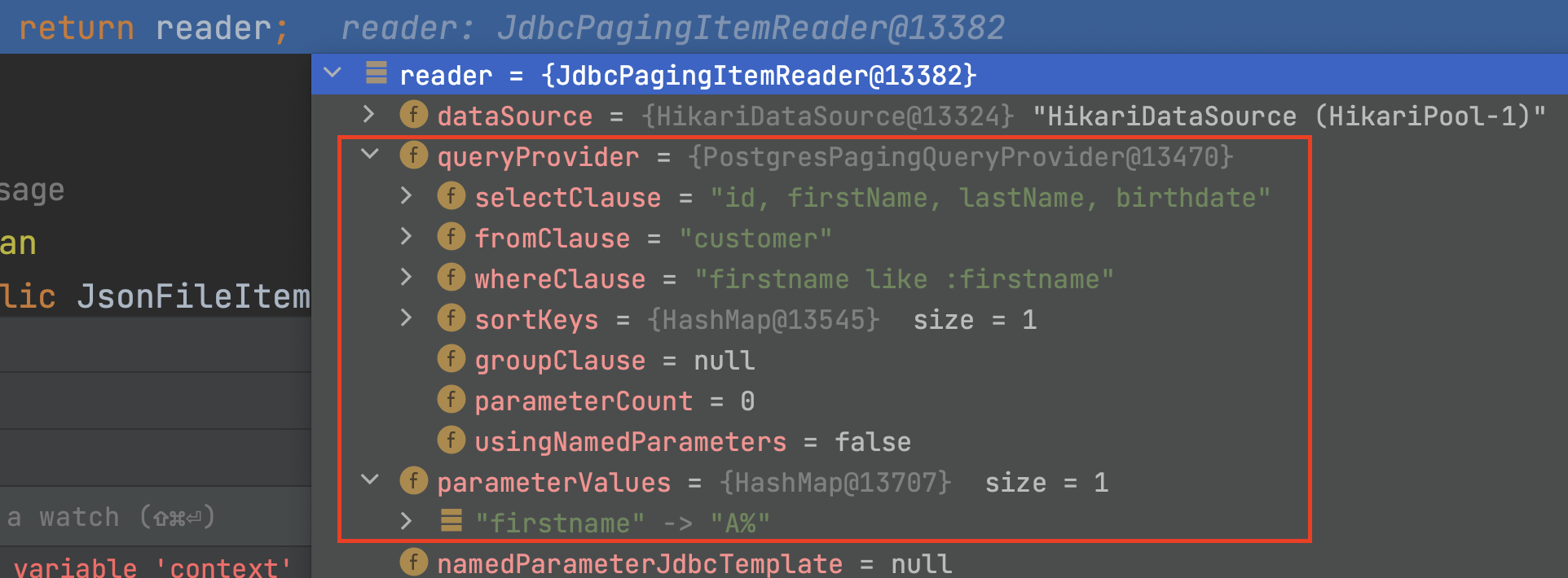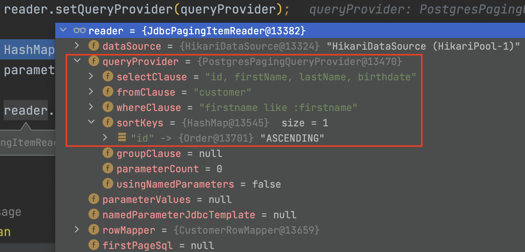▶ CustomRowMapper.java 설정과 PostgresPagingQueryProvider 설정을 추가한 후의 JdbcPagingItemReader<Customer> 타입의 reader 객체의 현재 시점의 상태는 아래와 같다.