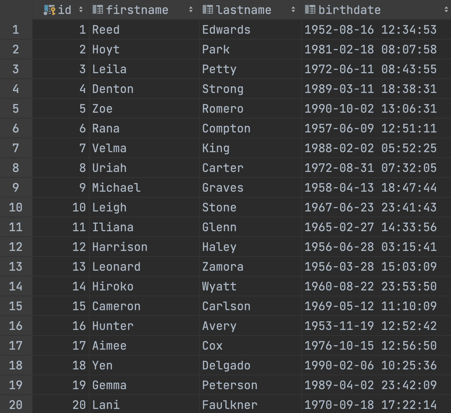 INSERT INTO customer (id,firstname,lastname,birthdate) VALUES (1,'Reed','Edwards','1952-08-16 12:34:53'),(2,'Hoyt','Park','1981-02-18 08:07:58'),(3,'Leila','Petty','1972-06-11 08:43:55'),(4,'Denton','Strong','1989-03-11 18:38:31'),(5,'Zoe','Romero','1990-10-02 13:06:31'),(6,'Rana','Compton','1957-06-09 12:51:11'),(7,'Velma','King','1988-02-02 05:52:25'),(8,'Uriah','Carter','1972-08-31 07:32:05'),(9,'Michael','Graves','1958-04-13 18:47:44'),(10,'Leigh','Stone','1967-06-23 23:41:43');