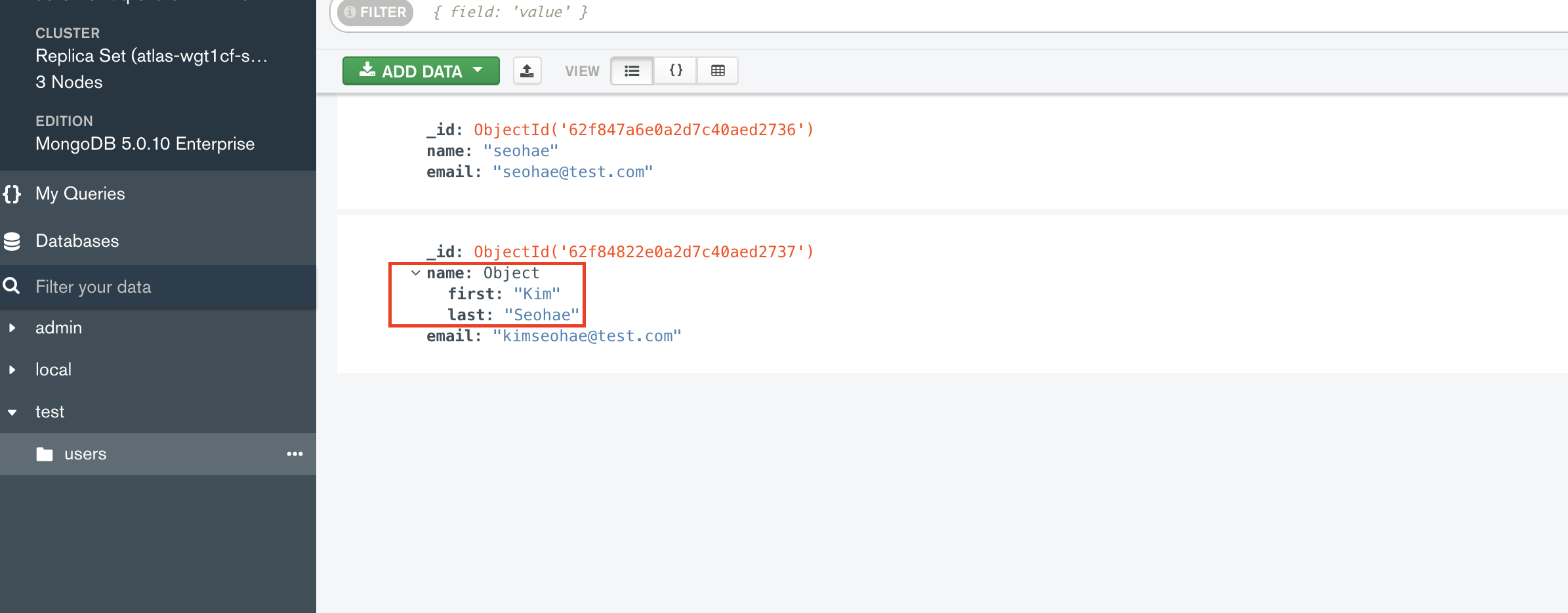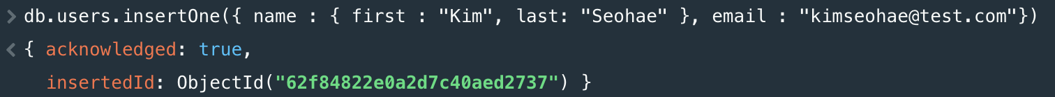 db.users.insertOne({ name : { first : "Kim", last: "Seohae" }, email : "kimseohae@test.com"})