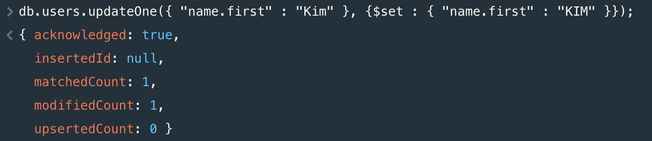 db.users.updateOne({ "name.first" : "Kim" }, {$set : { "name.first" : "KIM" }});