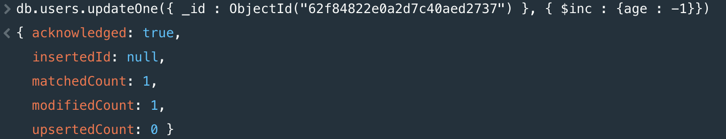 db.users.updateOne({ _id : ObjectId("62f84822e0a2d7c40aed2737") }, { $inc : {age : -1}})