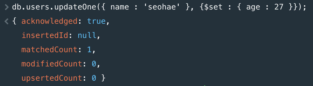 db.users.updateOne({ name : 'seohae' }, {$set : { age : 27 }});