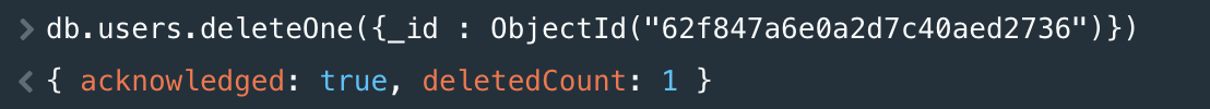 db.users.deleteOne({_id : ObjectId("62f847a6e0a2d7c40aed2736")})
