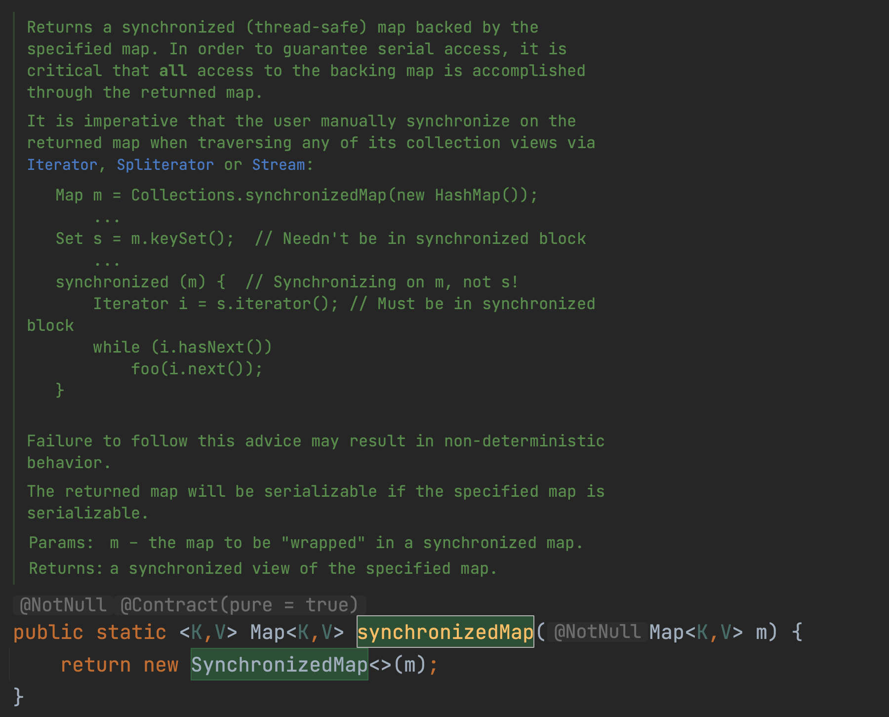 /* synchronizedMap이 반환한 맵의 컬렉션 뷰를 순회하려면 반드시 그 맵을 락으로 사용해 수동으로 동기화하라. */