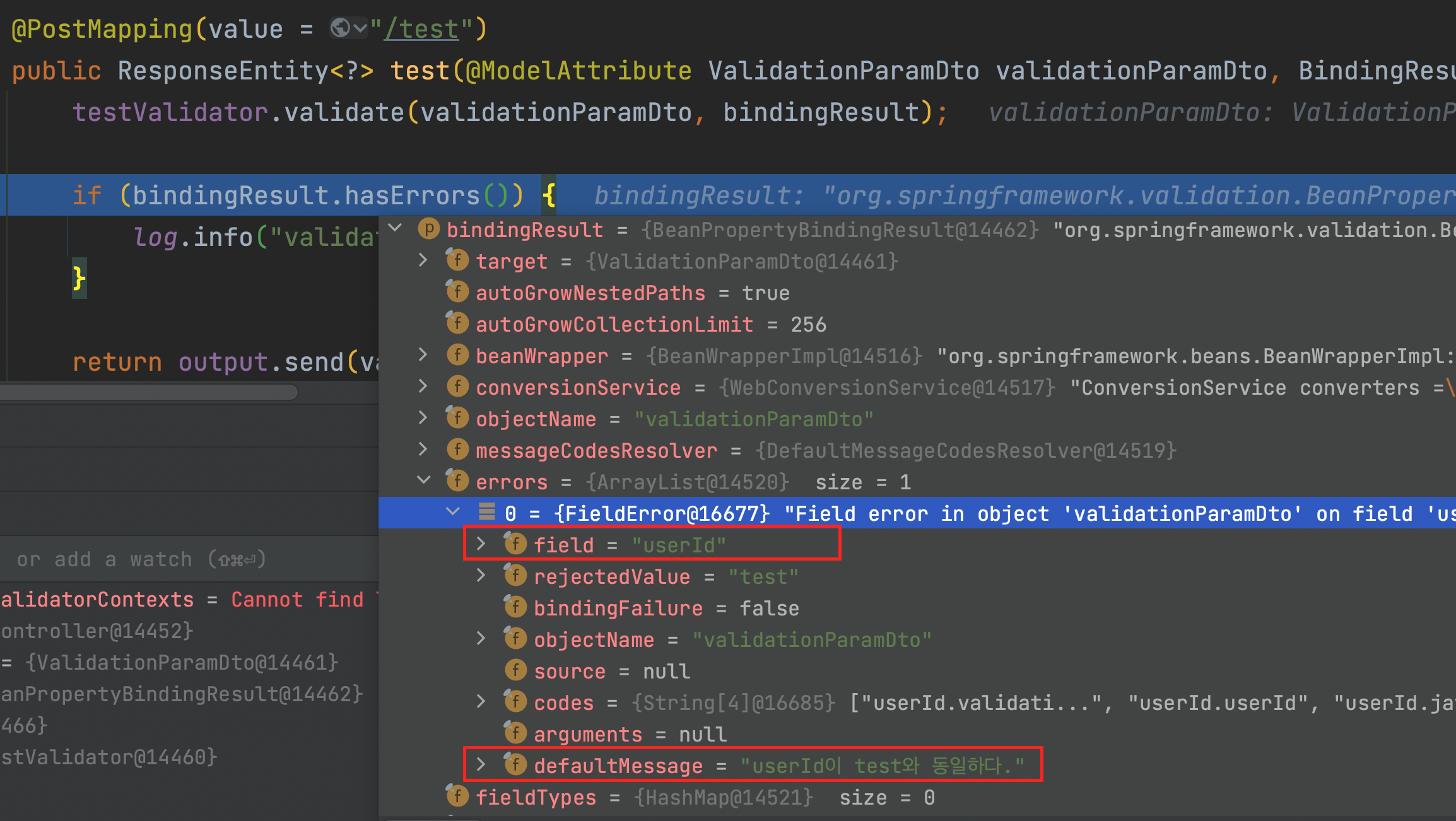 4) validation 체크가 된 후, bindingResult.hasErrors()를 디버깅해보자.