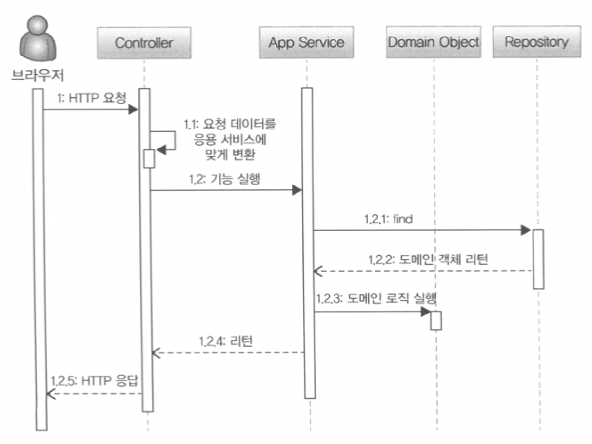 표현 영역은 사용자가 전송한 데이터 형식이 올바른지 검사하고 문제가 없다면 데이터를 이용해서 응용 서비스에 기능 실행을 위임한다. 이때 표현 영역은 사용자가 전송한 데이터를 응용 서비스가 요구하는 형식으로 변환해서 전달한다. 웹 브라우저를 이용해서 기능 실행을 요청하면 표현 영역에 해당하는 컨트롤러는 과정 1.1에서 HTTP 요청 파라미터를 응용 서비스가 필요로 하는 데이터로 변환해서 응용 서비스를 실행할때 인자로 전달한다.
