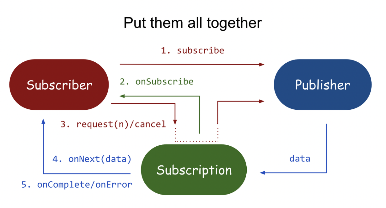 Subscriber -> Subscription(중개역할) -> Publisher -> 이벤트 발생 -> Subscriber