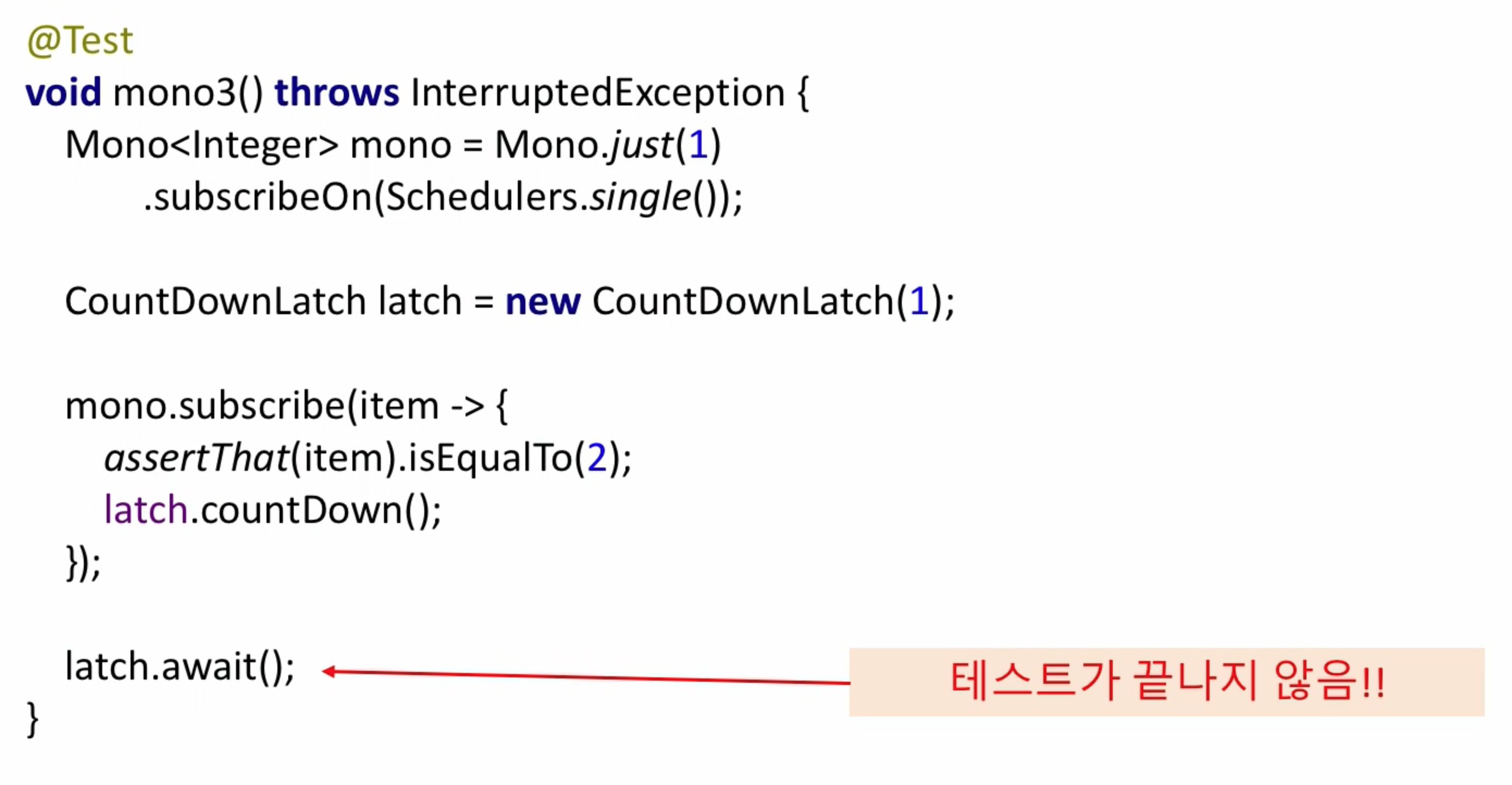 CountDownLatch 가 0이 될때까지 await()이 계속 실행되고 await() 실행하는 해당 스레드가 wait 상태에 빠진다. 2개의 스레드가 동작하는데 1개는 테스트 코드 로직을 수행하고, 다른 1개는 Mono 로직을 타고 온다. 여기서 문제는, assertThat 검증 후 countDown()을 호출해서 종료시키려고 하는데, 테스트가 성공하지 못한다면 아래 countDown()이 실행되지 않아서 테스트가 영원히 끝나지 못한다.