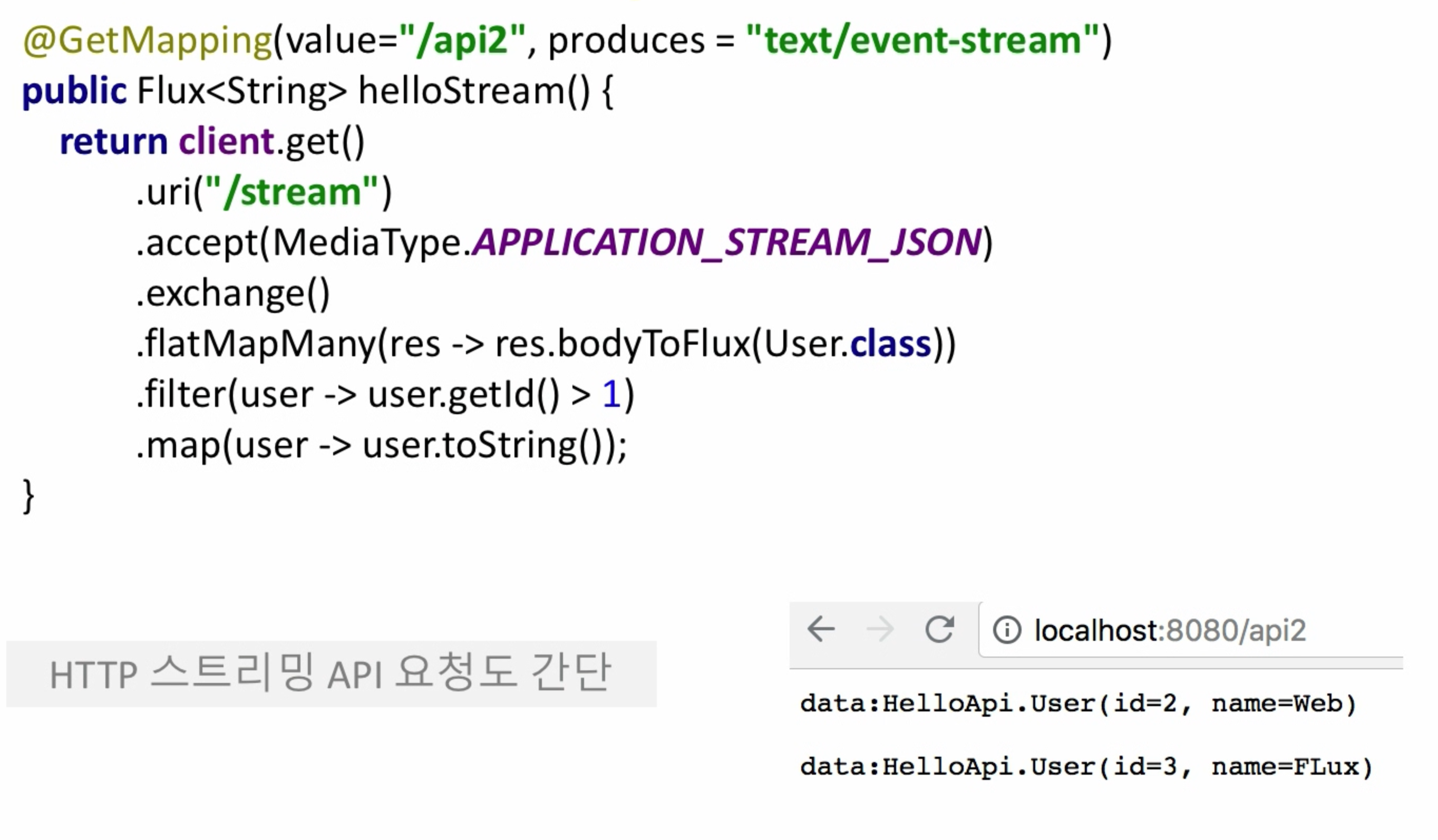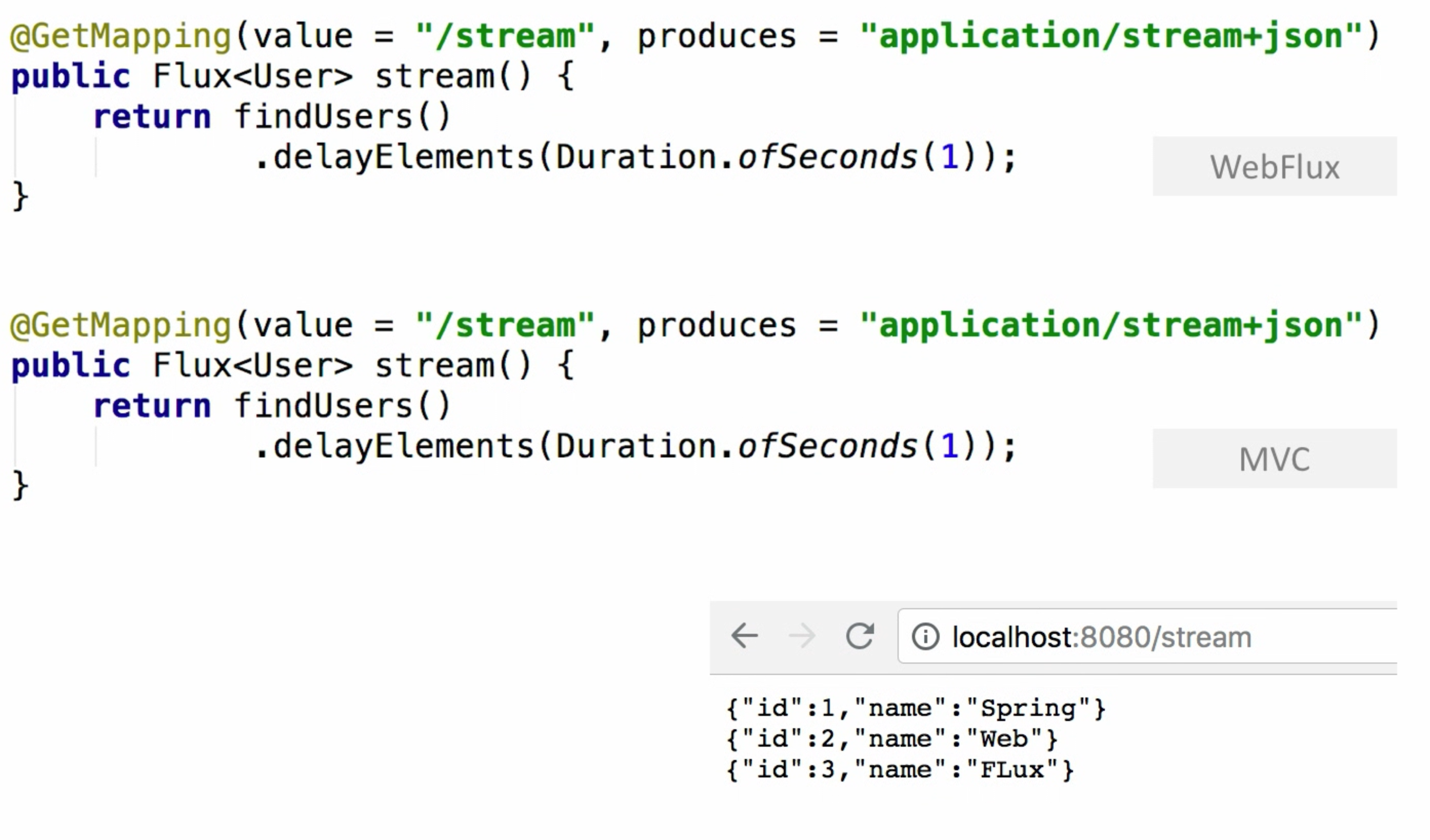 2) 웹 플럭스의 @Controller 코드에는 스프링 MVC에서 지원하지 않는 기능이 있다.