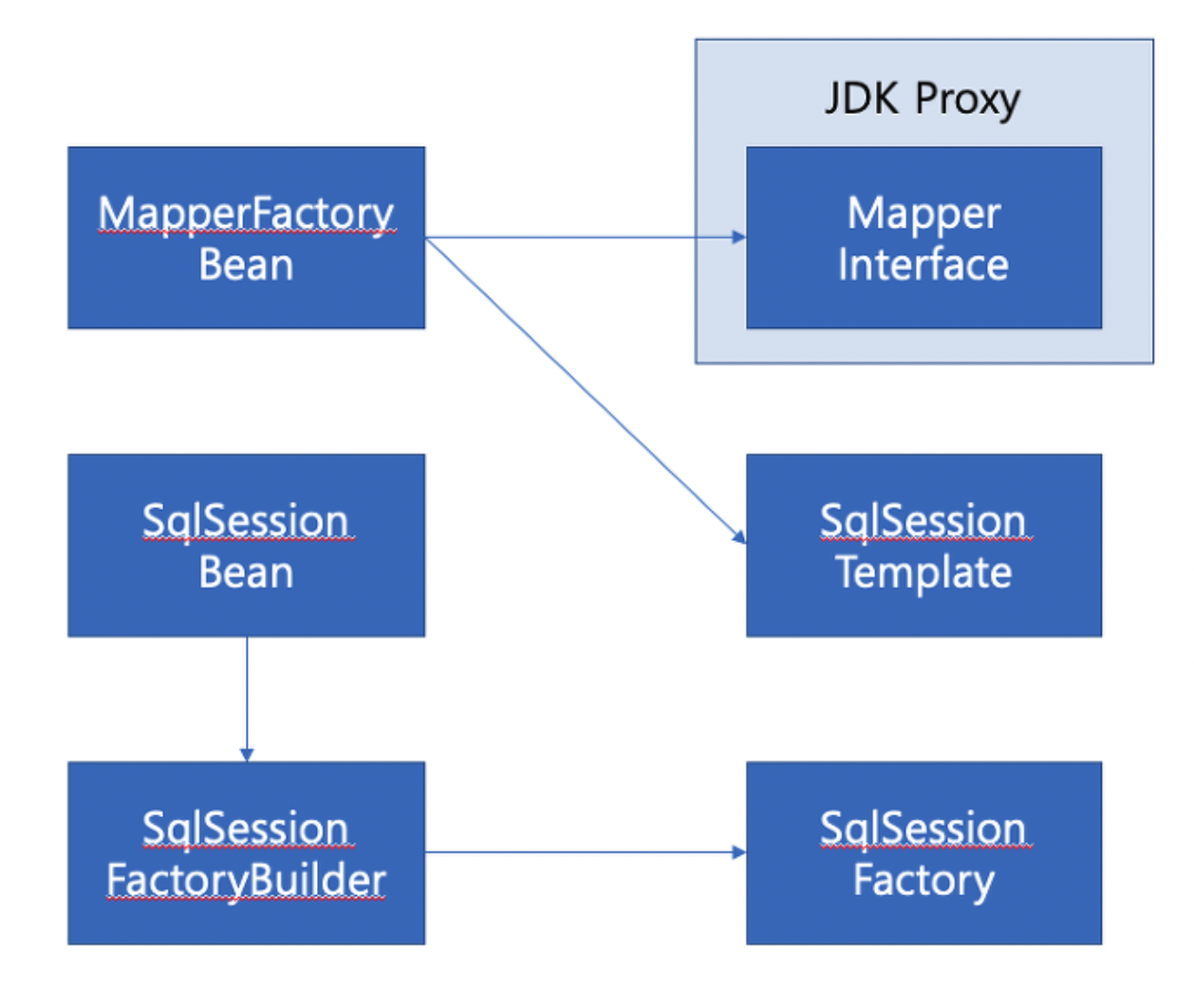 3) JDK Proxy(Mapper 인터페이스) -> SqlSessionTemplate