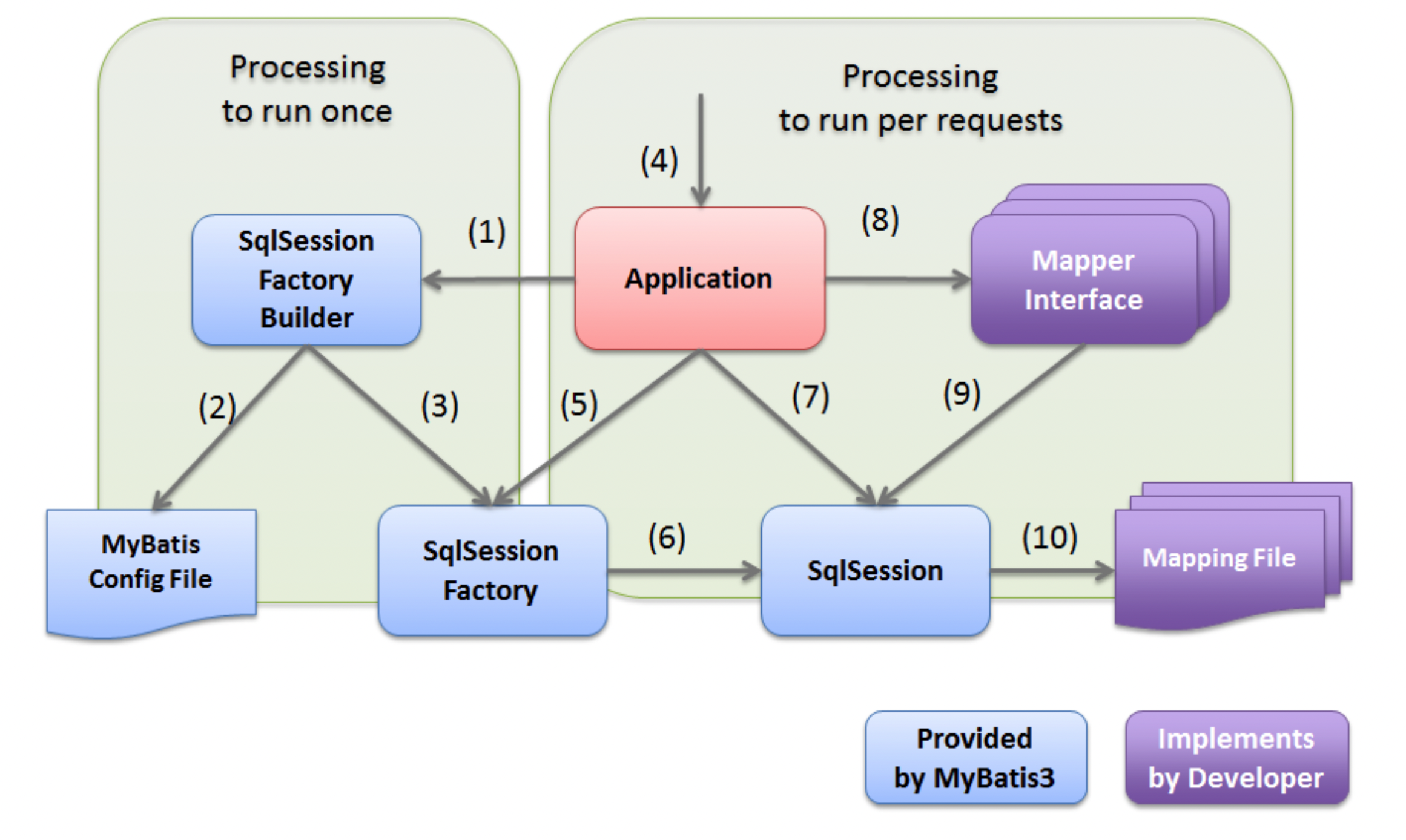 | 매핑 파일 | SQL과 객체의 매핑 정의를 기술하는 XML 파일이다. SQL을 어노테이션에 지정하는 경우에는 사용하지 않는다. 해당 파일을 SqlSession 객체가 참조한다. |