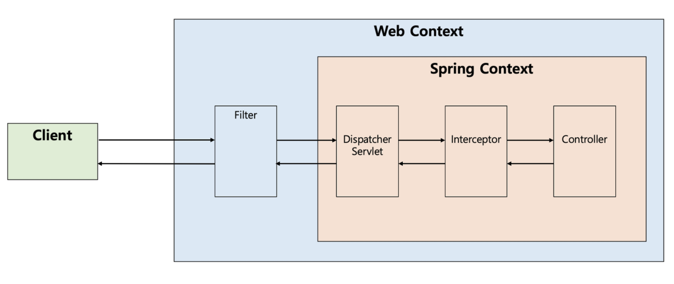 1) Client에서 요청은 서블릿 컨텍스트(Web Context)에서 Filter을 지난다.