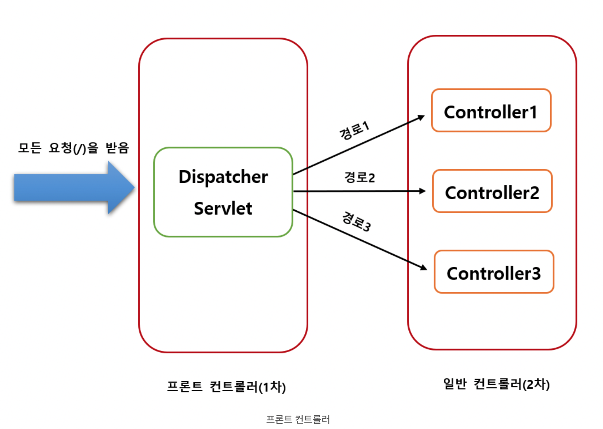 서블릿 컨테이너의 가장 앞단에서 들어오는 모든 요청을 먼저 받아, 적합한 컨트롤러에 위임해주는 프론트 컨트롤러다.